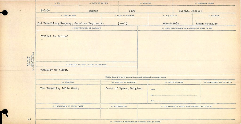 While brief, the story afforded me an opportunity to learn about tunnelling in the Canadian Expeditionary Force and also delve into the lives of some of the other men who served alongside Patrick, and sadly, killed alongside him. Like every narrative the story of the 2nd Canadian Tunnelling Company, and Patrick Giff, uncovered mysteries – some answered, some left untold.