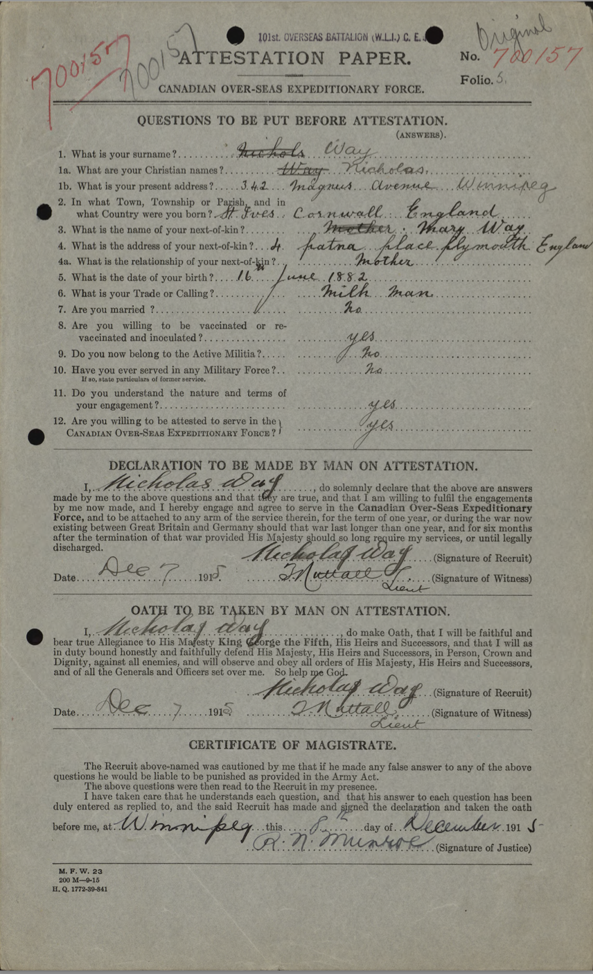 The story of Nicholas Way was fascinating both from the telling and from the research. Even after recounting his path to the Front and his death near Regina Trench there are so many questions left unanswered – his abandonment of his wife and children when he left for Canada in 1913 and the subsequent abandonment of his children by their mother in 1917, a year after his death, to name just two.