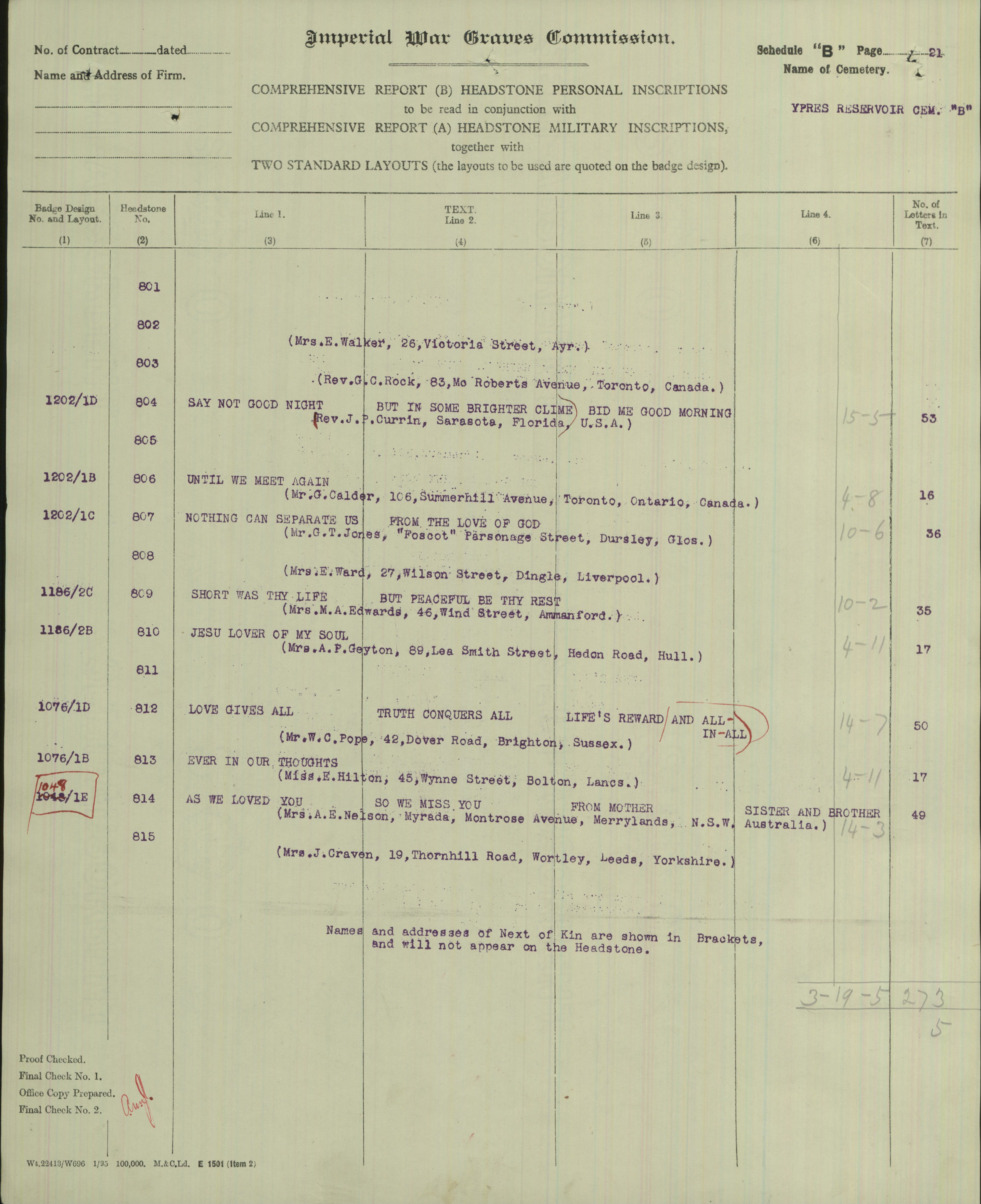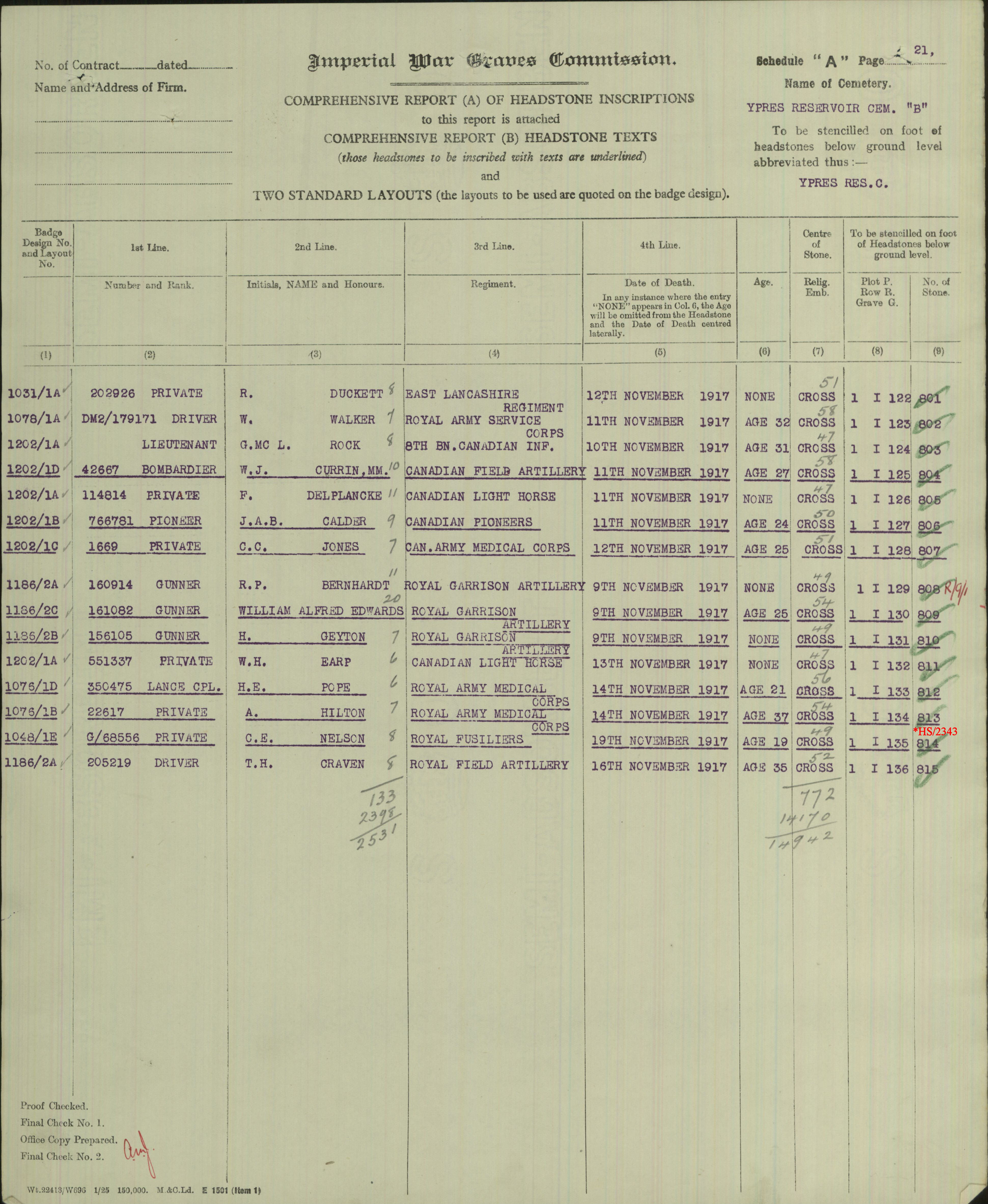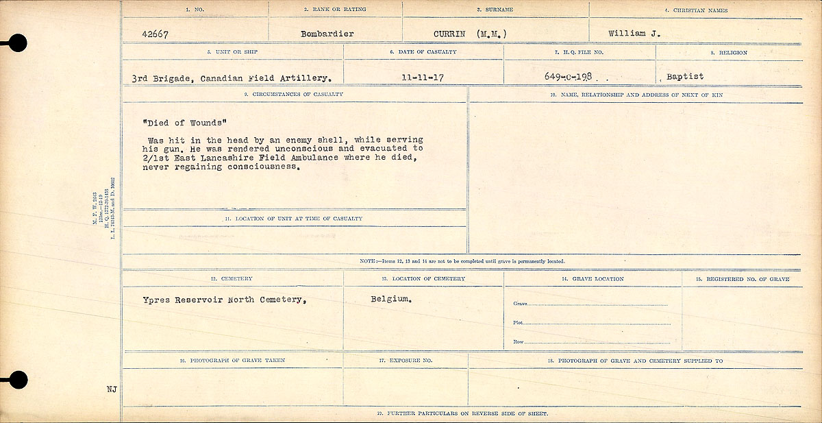 As I do when visiting The Front, I had taken a picture of many headstones, among them, William Currin’s in Ypres Reservoir cemetery.  It is a beautiful grave in a quiet cemetery on the outskirts of Ypres, befitting a man with courage and passion. Returning to Canada I decided to learn more about William Currin – I had his name, his regimental number and the battalion with which he served, and from there I dug in to unveil more.