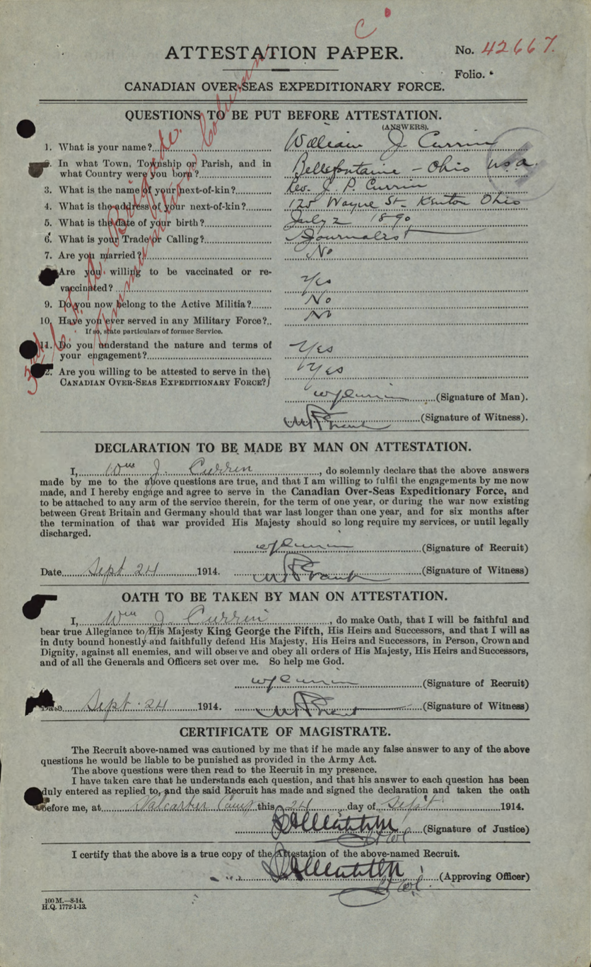 The Bombardier was a piece I wrote in 2009, before anything had been written about William Currin, and I thought now, with our relations with the United States probably the lowest they’ve ever been – certainly since the War of 1812 – might be the right time to touch it up and repost it.*  It’s a story from a time when the United States and Canada were the closest of allies – when Americans had the courage of their convictions and enlisted in the Canadian Expeditionary Force to fight in the First World War. It is estimated that approximately 36,000 Americans joined the Canadian army to fight in the War.